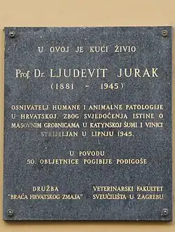 Людевит Юрак (6 октября 1881 г., Залуга, Хум-на-Сутли, — 9 июня 1945 г., Загреб) — хорватский патологоанатом и судебный медик. Считается основателем медицинской патологической анатомии человека и ветеринарной патологической анатомии в Хорватии.[3] Казнён за то, что в 1943 г. участвовал в расследовании расстрелов в Виннице эпохи «большого террора».