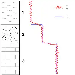 - Литологическое расчленение разреза на пласты. Интенсивность гамма-излучения отличается у разных пластов пород, так как в них содержится разное количество радиоактивных элементов. Наибольшие показания у породы, содержащей калий-40, радий и другие радиоактивные элементы; отдельно следует упомянуть граниты и глины, содержащие большое их количество. Минимальные значения наблюдаются у карбонатов и чистых песчаников, углей, пород гидрохимического происхождения, хемогенных осадков (ангидритов, гипсов, галита).