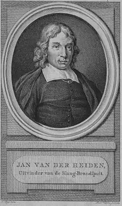 Ян ван дер Хейден известен также и как автор технического и организационного усовершенствования работы пожарных служб Амстердама. В 1672 году он усовершенствовал пожарный насос и продемонстрировал своё изобретение в ратуше и на Вестерторене в Амстердаме. В 1700 году он издал «Книгу огнетушителей» (Brandspuyten-boek) — первое научное руководство по борьбе с пожарами. Он также занимался вопросами механики, и в 1690 году опубликовал учебник по механике с собственными иллюстрациями.