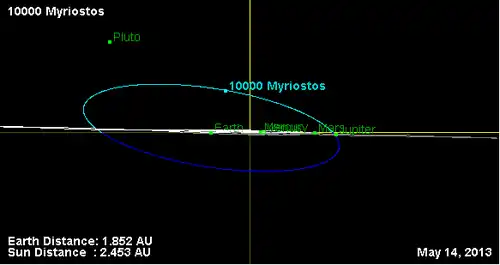 ![]() Орбита астероида (10000) Мириостос (синим), орбиты планет (красным) и Солнце в центре (чёрным). | |
