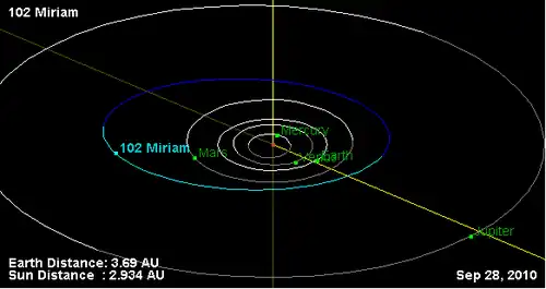 (102) Мириам (лат. Miriam) — астероид из группы главного пояса, который был открыт 22 августа 1868 года германо-американским астрономом К. Г. Ф. Петерсом в обсерватории Литчфилд, США и назван в честь Мириам, одного из персонажей Библии[1]. Это название вызвало некоторые противоречия, потому что в то время астероидам давали имена мифологических фигур и набожные люди не рассматривали библейские фигуры как таковые.