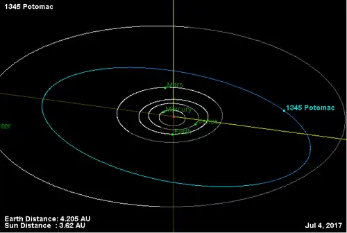 (1345) Потомак (лат. Potomac) — астероид внешней части главного пояса, который принадлежит к спектральному классу X и входит в состав семейства Хильды. Астероиды данного семейства находятся в сильнейшем орбитальном резонансе с Юпитером 3:2[1]. Он был обнаружен 23 сентября 1913 года американским астрономом Джоэлом Меткалфом в обсерватории города Тонтон и назван в честь реки Потомак, на востоке США[2].