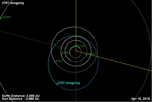 (3757) Анаголай (лат. Anagolay) — небольшой околоземный астероид из группы Амура (II), который принадлежит к светлому спектральному классу S. Он был открыт 14 декабря 1982 года американским астрономом Элеанор Хелин в Паломарской обсерватории и был назван в честь богини потерянных вещей филиппинского племени Тагалы[5]. Название было предложено филиппинским студентом Mohammad Abqary Alon в рамках конкурса, организованного Space Generation Advisory Council, и было выбрано из 85 других вариантов[6].