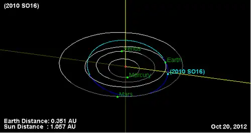 (419624) 2010 SO16 — маленький околоземный астероид из группы аполлона, обладающий крайне интересной орбитой: очень близкой к орбите Земли, но не допускающей приближений астероида к нашей планете менее, чем на 0,15 а.е. Астероид был открыт 17 сентября 2010 года с помощью инфракрасного космического телескопа WISE, данные с которого были проанализированы в обсерватории Армы, близ одноимённого города в Ирландии[2]. Абсолютная звёздная величина этого астероида составляла всего 20,7m. Таким образом, для его наблюдения требуются очень крупные телескопы. При неизвестном альбедо поверхности, это позволяет оценить размер астероида в 200–400 метров.
