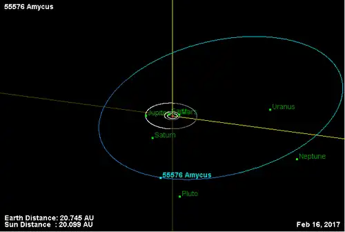 - ↑ AstDys (55576) Amycus Ephemerides. Department of Mathematics, University of Pisa, Italy. Дата обращения: 15 марта 2009. Архивировано из оригинала 26 мая 2011 года.