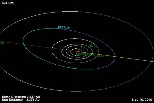 (634) Уте (нем. Ute) — астероид главного пояса, который относится к спектральному классу X. Открыт 12 мая 1907 года немецким астрономом Августом Копффом в Гейдельбергской обсерватории. В 2008 году астроном Rene Roy показал, что синодический период обращения равен примерно 11, 7554 часа[1].