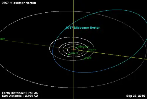 - Орбита астероида Мидсомер Нортон и его положение в Солнечной системе