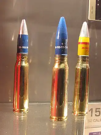 20 × 102 мм — патрон, разработанный в США , а затем нашедший применение в системах авиационного вооружения M621, M61 Vulcan, M197 electric, cannon M39. Позднее стал применяться и в снайперских винтовках, например Anzio 20mm rifle в качестве антиматериального оружия, а также для уничтожения бронетехники и живой силы. Его калибр по квалификации калибров относится скорее к малокалиберным снарядам, нежели к пулям.