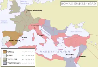 Январь — Рейнские легионы восстали и провозглашают императором Вителлия. Вителлий стал называть себя Германиком. 11.1 — Гальба усыновил Пизона и назначил его своим преемником. 15.1 — Преторианцы в Риме поднимают мятеж, убивают Гальбу и провозглашают императором Отона. Убийство Виния и Пизона.