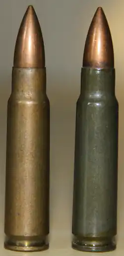 Боеприпас имел бутылочной формы гильзу с проточкой, и допускалось его снаряжение любыми типами пуль. В базовом снаряжении применялась пуля остроконечной формы весом 8,4 г, обладавшая начальной скоростью 744 м/с и дульной энергией 2325 Дж. Патрон 7,62×45 мм хоть внешне и был похож на патрон советского производства, но отличался от него габаритами и превосходил боеприпас 7,62×39 мм по мощности.