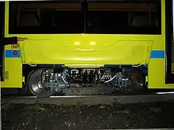 Трамвайный вагон укомплектован тележками двух типов: моторные подкатываются под головные секции, бегунковая — под среднюю.