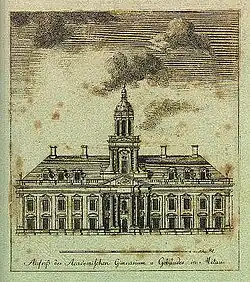 В январе 1773 года Пётр Бирон передал для нужд академии здание своего старого дворца на Дворцовой улице (Палеяс, фр. rue des Palais), где после возвращения из ссылки жил его отец Эрнст-Иоганн[6]. Старое здание впоследствии было снесено, и к 1775 году придворный курляндский архитектор Северин Йенсен построил новое здание по проекту в стиле барокко с чертами классицизма. На первом этаже помимо учебных помещений находились также зал для танцев и фехтования, а также зал заседаний совета Академии; на втором этаже находится зал для празднеств, а также две аудитории — библиотека и карцер для провинившихся студентов. В куполе двухэтажной надвратной башни была оборудована астрономическая обсерватория.