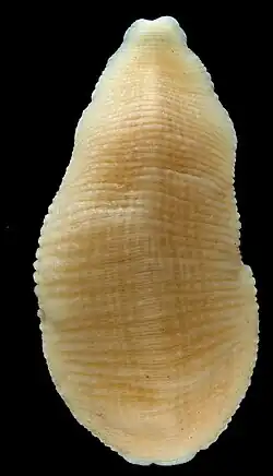Окраска тела в фиксированном состоянии бежевая, у живых особей, вероятно, более интенсивная, желтовато-коричневая до коричнево-зелёной. Края тела прозрачные. По спинной стороне проходит порядка 30 очень узких, местами прерывистых, тёмных продольных полос, хорошо заметных при подсветке особи.