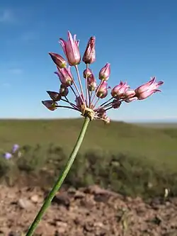 Чехол рано опадающий, тонко-перепончатый. Зонтик коробочконосный, пучковатый, позднее почти шаровидный, малоцветковый, рыхлый. Цветоножки равные, в два—три раза длиннее околоцветника, при основании с прицветниками. Листочки узкоколокольчатого околоцветника, розовые, с пурпурной жилкой, равные, ланцетные, острые или островатые, длиной 6—7 мм. Нити тычинок на четверть короче листочков околоцветника, на четверть между собой и с околоцветником сросшиеся, шиловидные; пыльники жёлтые. Столбик не выдается из околоцветника.
