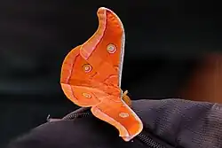 Размах крыльев 140—174 мм. Окраска крыльев вариабельная, они могут быть оранжеватыми или желтовато-серо-коричневыми, затемненными по наружному краю. Тело вальковатое, густо опушенное. Усики двусторонне-перистые. Костальный край передних крыльев слегка вдавлен у основания, круто выгнут перед серповидно приострённой вершины, розовато- или коричневато-серый. На переднем крыле жилка R: тонкая, отходит самостоятельной ветвью. Жилка M2 на общем стебле с R5+M1. Каждое крыло с крупным глазчатым пятном с округлой формы и прозрачным ядром.