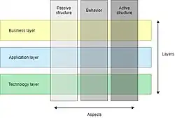 Основные сущности и типы связей языка ArchiMate можно рассматривать как структуру, так называемый ArchiMate Framework. Он разделяет архитектуру предприятия на уровень бизнеса, приложений и технологий. На каждом уровне рассматриваются три аспекта: активные элементы, внутренняя структура и элементы, которые определяют использование или передачу информации. Иными словами: субъект, действие, объект.