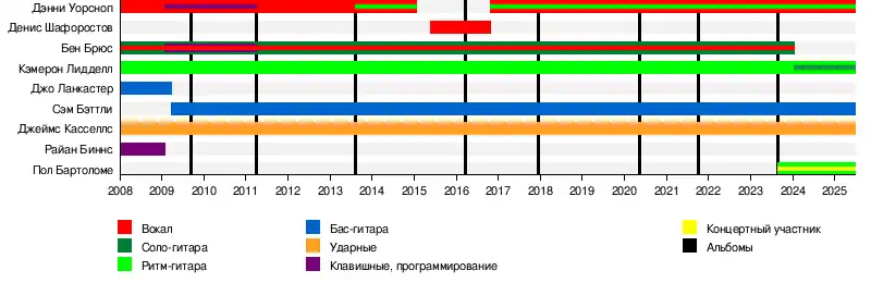 - Бен Брюс — соло-гитара, дополнительный вокал (2008—2024), клавишные, программирование (2009—2011)