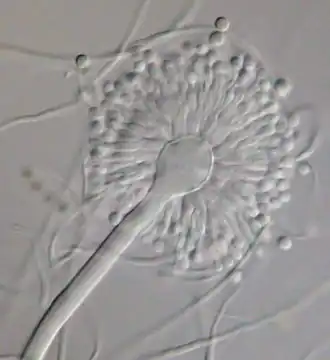 Конидиеносные головки двухъярусные, с жёлтостенной ножкой 300—600 мкм длиной, с незначительным до почти шаровидного апикальным вздутием до 12—16 мкм. Метулы покрывающие верхнюю половину или две трети вздутия (если оно слабо выражено, то часто только его конец) 5,5—8 мкм длиной. Фиалиды 5—7,5 мкм длиной. Конидии шаровидные, шероховатые до шиповатых, очень мелкие, 2—2,5 мкм в диаметре.