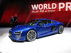 Существует и полностью электрическая версия R8 под именем e-tron. Модель имеет статус прототипа, но тем не менее собрано 12 экземпляров. Привод только задний — два электромотора на задней оси позволяются развивать 380 л. с. и 820 Нм крутящего момента, что позволяет разгоняться электрокару от 0 до 100 км/ч за 4,2 секунды. Максимальная скорость ограничена 200 км/ч электроникой. Сделано это с целью экономии электроэнергии, трата которой на более высоких скоростях чрезмерно высокая (см. энергетика). Центр тяжести у электрической R8 смещен вниз и это позволяет проходить крутые повороты гораздо увереннее, нежели бензиновые собратья. Этому также сильно способствует автоматическая электронная система регулировки крутящего момента Torque Vectoring, которая распределяет усилие на каждое колесо отдельно[12].