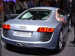 В 2003 году был представлен первый прототип Audi Le Mans quattro на автосалоне во Франкфурте в честь трёхкратной успешной победы на соревнованиях 24 часа Ле-Мана в 2000, 2001 и 2002 годах. Позднее на его платформе был собран Audi RSQ — концепт-кар, созданный компанией Audi специально для фильма «Я, робот» в 2004 году. После громкого маркетингового успеха автомобиль пошел в серию под именем Audi R8, в честь легендарного гоночного болида R8 Le-Mans который стал не превзойденным победителем. Audi начала участвовать в гонках на прототипах спорткаров в 1999 году, дебютировав на гонке 24 часа Ле-Мана. Были разработаны и участвовали в гонках в первом сезоне две концепции автомобилей — Audi R8R (прототип открытого кокпита «родстер») и Audi R8C (прототип закрытого кокпита «купе» GT). R8R занял достойное место на подиуме во время своего гоночного дебюта в Ле-Мане и стал концепцией, которую Audi продолжила развивать в сезоне 2000 года из-за благоприятных правил для прототипов открытого кокпита. Поддерживаемая заводом команда Joest Racing трижды подряд побеждала в Ле-Мане на Audi R8 (2000–2002), а также выиграла все гонки в Американской серии Ле-Ман в свой первый год. Audi также продала автомобиль командам-клиентам, таким как Champion Racing . Audi вернулась на подиум победителей в гонке 2004 года, и все три лучших финишера были на R8: Audi Sport Japan Team Goh заняла первое место, Audi Sport UK Veloqx второе, а Champion Racing третье. В 2005 году на гонке 24 часа Ле-Мана Champion Racing выставила два R8, а также R8 из Audi PlayStation Team Oreca . R8 (которые были построены по старым правилам LMP900) получили более узкий ограничитель воздухозаборника, что снизило мощность и увеличило вес на 50 кг (110 фунтов) по сравнению с новым шасси LMP1. В среднем R8 отставали от Pescarolo – Judd примерно на 2–3 секунды . Но с командой превосходных водителей и опытом оба Champion R8 смогли занять первое и третье места, в то время как команда Oreca заняла четвертое место. Команда Champion также стала первой американской командой, выигравшей Ле-Ман после Gulf Ford GT в 1967 году. Это также завершает долгую эру R8; однако его замена на 2006 год под названием Audi R10 TDI была представлена 13 декабря 2005 года.