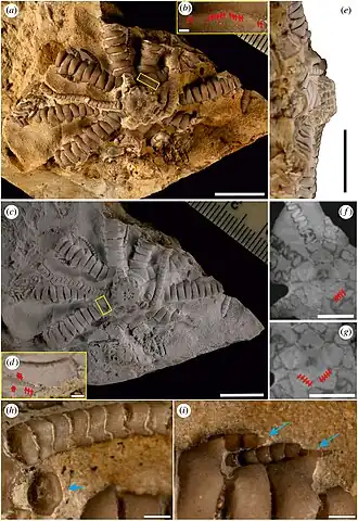 ![]() Окаменелость морской лилии Ausichicrinites zelenskyyi. Длина масштабной линейки 10 мм (a) и 1 мм (b). | |||||||||||||||||||||||||||||||||||||||||