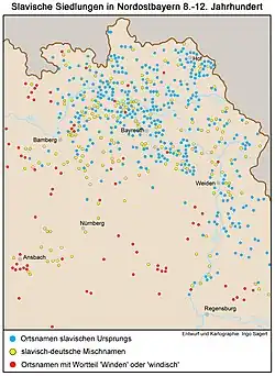В топонимии Верхней Франконии и Верхнего Пфальца часто встречаются славянские наименования с суффиксами -itz (от славянского -ица, -ицы), -au (от славянского -ов, -ово) и др.; также нередки немецкие названия с корнем -wind-, указывающие на то, что немцы ассоциировали данные места с присутствием «вендов».