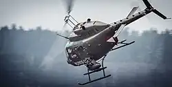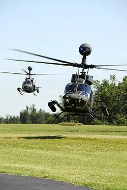 Bell OH-58 Kiowa — семейство однодвигательных военных вертолетов, в основном используемых для наблюдения, связи и непосредственной огневой поддержки. Основной задачей оригинального OH-58A было целеуказание для других средств огневого поражения, таких как ударный вертолет Bell AH-1 Cobra или для подразделений наземной артиллерии. Он не имел никакого вооружения и весил 1451 кг при полной загрузке, имея возможность перевозить небольшое количество груза или до двух пассажиров[10]. В то время как первые версии зависели от экипажа в проведении разведки и наблюдения за полем боя, более поздние модели были оснащены сложными оптико-электронными системами и датчиками для более точного целеуказания. На более поздних вариантах OH-58 грузоподъемность также была значительно увеличена, в частности, OH-58D Kiowa был разработан для перевозки грузов в 2495 кг, что на 72% больше, чем у оригинальной версии[10].