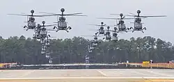 32 вертолета OH-58 Kiowa Warrior, приписанных к 82-й бригады армейской авиации поднимаются в небо во время своего последнего учебного полета в Северной Каролине, 15 апреля 2016 года. Заключительный пролет был посвящен всем военнослужащим, которым выпала честь летать и служить на этом вертолёте.