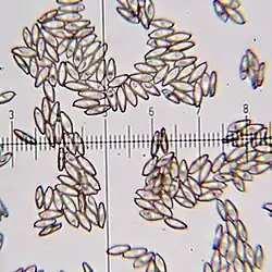 - Споровый порошок оливково-коричневого цвета. Споры жёлтые, 12—18×4—6 мкм, гладкие, эллипсоидной или веретеновидной формы.