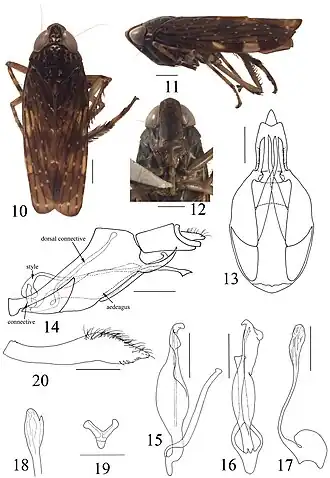 Скутеллюм короткий, его длина почти равна длине пронотума. Голова сравнительно длинная, передний край округлый, отчётливо уже пронотума; лоб широкий и длинный. Глаза относительно крупные, вытянуто-яйцевидные; оцеллиимелкие. Клипеус длинный и широкий. Эдеагус асимметричный, длинный. Сходны по габитусу с Tinocripus, отличаясь деталями строения гениталий. Род включают в состав подсемейства Coelidiinae[1].