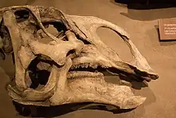 Череп животного вытянут. Его задняя часть широка, однако морда сильно сужена. В области клюва находится большое расширение, образующее костную сердцевину для роговой оболочки. Ноздри очень велики. Носовые кости образуют узкую высокую дугу, возвышавшуюся над большей частью рыла и переходившую в гребень. Гребень не полый, а состоит из массивной кости. Вдоль верхнего края проходит низкая костная грань.