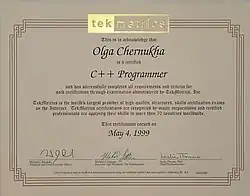 - Бесплатные — тесты, не требующие оплаты и после окончании которых выдается сертификат[2] (высылается в бумажном виде на географический почтовый адрес клиента).