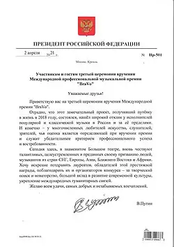 12. Путин отметил большой вклад в развитие культуры лауреатов премии BraVo. РИА Новости (2 апреля 2021). Дата обращения: 13 августа 2021. Архивировано 13 августа 2021 года.