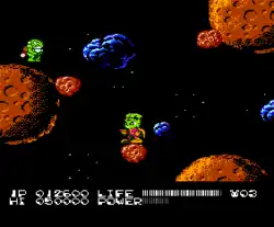 Игровой процесс. Бакки перемещается по Жёлтой планете, используя быстро летающие астероиды как платформы.