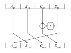 где Xi представляет входные 32-бита данных, Wj входные 8-бит данных в Sj функции, Kmi и Kri представляют маскирующий подключ и подключ сдвига соответственно, Yi, есть выходные 32-бита данных, после воздействия раундовой функции, «» операции «+» и «-», представляют собой сложение и вычитание соответственно по модулю 2. Обозначение «» представляет левый сдвиг V по отношению к U. W, Xi, Yi и Kmi, все они представляют собой 32-битные субблоки. Kri имеет длину 5 бит. Расшифровывание осуществляется по аналогии с шифрованием, с той лишь разницей, что подключи используются в обратной последовательности.