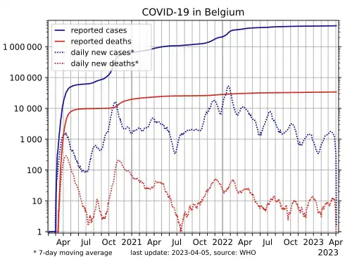 Первый раскрытый случай был 15 февраля 2020 года[77]. По состоянию на 5 апреля Sciensano сообщил о 3986 выписанных пациентах с 15 марта[78][78].
