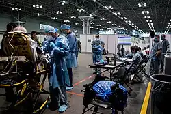 Ситуация в Больничном центре Элмхёрста в Куинсе была описана одним из врачей как «апокалиптическая»[56]. Члены семей пациентов с коронавирусом не допускаются в больницу[57]. 25 марта несколько новостных агентств сообщили, что больница достигла «переломного момента» после того, как 13 пациентов умерли в течение 24 часов[58][59]. Число поступлений уменьшилось в течение первой недели апреля, но врачи сказали, что причина в том, что они посылали домой пациентов, которые были бы приняты, если бы было для них место[60].