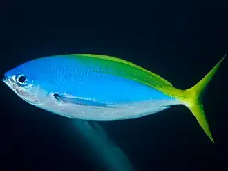Хвостовой плавник, хвостовой стебель и тело выше диагонали от начала спинного плавника до нижнего начала хвостового стебля ярко-жёлтого цвета. У крупных особей, особенно в западной части Тихого океана, жёлтая окраска не распространяется так далеко к началу тела. Остальные верхние две трети тела ярко-синие, а нижняя треть тела серебристо-белая. Пазухи и основания грудных плавников чёрные. Грудные, брюшные и анальный плавник белого цвета; спинной плавник голубоватый в проксимальной части и жёлтый — в дистальной[3].