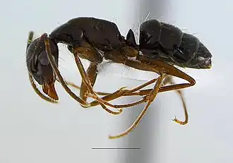 Муравьи среднего размера (менее 1 см). Основная окраска тела коричневого цвета. Проподеум без эпинотальных шипиков или зубцов. Стебелёк между грудкой и брюшком состоит из одного членика (петиолюс), несущего вертикальную чешуйку. Социальный паразит в гнёздах муравьёв Camponotus aethiops и Camponotus pilicornis. [1][3][4]. Первый и долгое время единственный социальный паразит в составе крупнейшего муравьиного рода Camponotus (второй предположительно паразитический вид Camponotus ruseni был описан в 2012 году из Турции)[5].