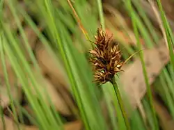 Соцветие колосовидное или головчатое, густое, широкояйцевидное, яйцевидное или продолговато-яйцевидное, (1)1,5—1,5(2,2) см длиной, 0,8—1,3 шириной, бурое, из 4—8 колосков. Колоски гинекандрические (у основания тычиночные), 0,5—0,7 см длиной. Кроющие чешуи яйцевидные, острые, сплошь тёмно-коричневые или, иногда, с очень узкими, едва заметными белоперепончатыми краями, короче мешочков. Мешочки вогнуто-выпуклые, яйцевидные, (3,2)4—4,5 мм длиной, (1,5)1,7—2 мм шириной, по краям с узким крылом, бурые или зеленовато-бурые, в зрелом состоянии прижатые, слегка отклонённые от оси колоска или растопыренные, по краю с узким, кверху выгрызенно-зубчатым крылом, сверху с 6—8 жилками[1], сзади без жилок или с неясными жилками у основания, сидячие, со светло-коричневым, удлинённым, коротко-двузубчатым носиком, спереди глубоко расщеплённым. Кроющие листья чешуевидные, самые нижние иногда узколинейные.