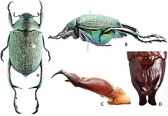 Длина тела от 25 до 42 мм. Спинная часть тела металлически блестящая, зелёная. Самцы с морщинистыми надкрыльями и длинными ногами. Встречаются во влажных и сухих тропических лесах на высотах от 180 до 1000 м с февраля по май. Жуки ассоциированы с такими растениями как буддлея (норичниковые), Gynerium sagittatum (Poaceae), Senna reticulata и леуцена светлоголовчатая (бобовые). Личинки и куколки сходны с родом Pelidnota[3][4].