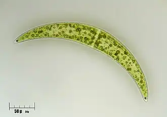 Клетки одиночные, редко склеивающиеся в пучки, обычно серповидно-согнутые, редко прямые. Состоят из двух симметричных половинок[1]. На концах заметно суживаются и содержат вакуоли с кристалликами сульфата бария (ранее считались кристаллами сульфата кальция[1]), совершающие броуновское движение[2]. Серединной перетяжки нет. В поперечном сечении круглые. Оболочка клетки гладкая или штрихованная, всегда с порами, которые могут быть круглыми, овальными или продолговатыми[1]. Через крупные поры на концах клеток выделяется слизь, принимающая участие в движении клеток[2]. В каждой полуклетке по одному крупному осевому хлоропласту. Пиреноиды шаровидные, эллипсоидные, расположенные в один ряд или беспорядочно разбросанные по хлоропласту[1]. Ядро расположено в плоскости симметрии клетки. Его можно увидеть в живом состоянии[2].