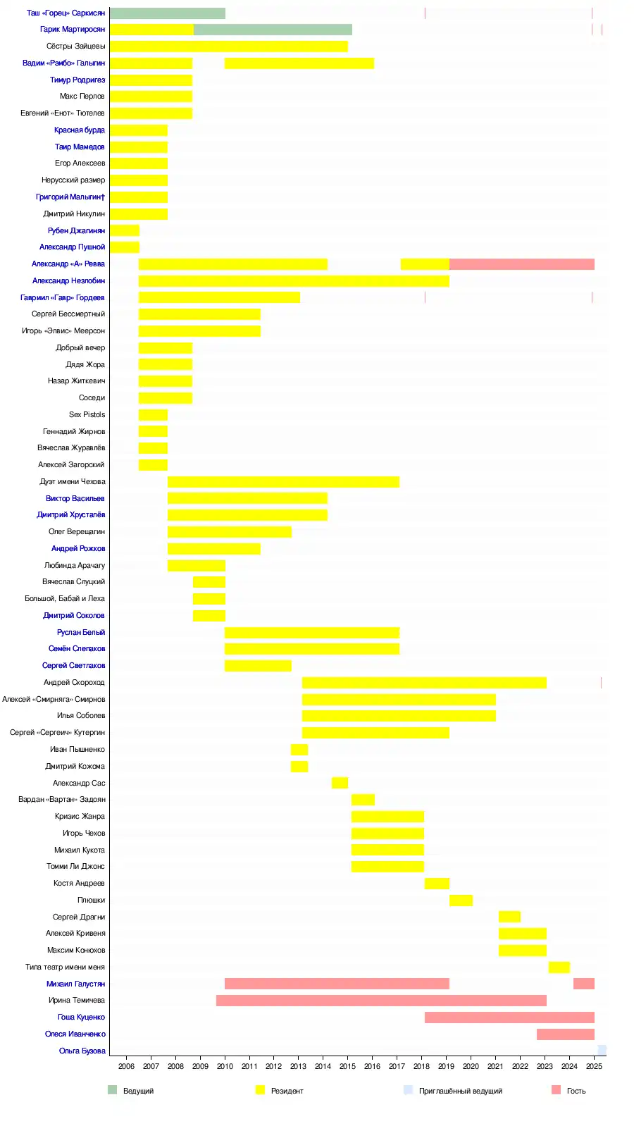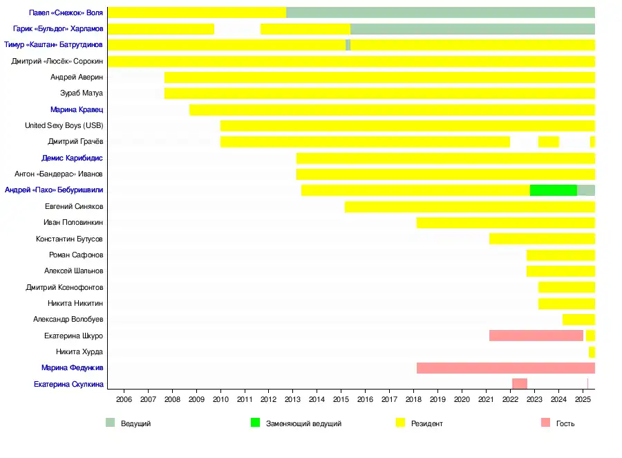 Нынешние резиденты шоу — Павел Воля (ведущий), Гарик Харламов (ведущий), Тимур Батрутдинов, Демис Карибидис, Марина Кравец, Женя Синяков, Андрей Бебуришвили (ведущий), Иван Половинкин, Зураб Матуа, Дмитрий Сорокин, Андрей Аверин, Антон Иванов, United Sexy Boys[a], Дмитрий Грачёв, Константин Бутусов, Роман Сафонов, Алексей Шальнов, Дмитрий Ксенофонтов, Никита Никитин, Александр Волобуев, Екатерина Шкуро и Никита Хурда.