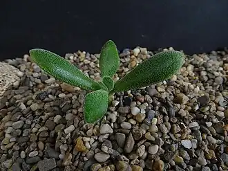 Многолетний сильно разветвленный вечнозеленый суккулент формирует плотные грозди диаметром до 20 см, а в период цветения достигает высоты до 35 см, при этом старые листья сохраняются. Корни мочковатые. Ветви варьируют от полегающих до восходящих, имеют диаметр 6–7 мм и почти квадратную форму. Междоузлия находятся на расстоянии 12–15 мм друг от друга, а поверхность плотно покрыта белыми загнутыми ресничками около 0,5 мм, которые прижаты к поверхности и направлены к основанию[2].