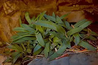 Листья обратноланцетно-продолговатые, размерами 20-40(-80) x 5-15(-20) мм, острые, уплощенные в дорзивентральном направлении, но слегка выпуклые с обеих сторон. Они голые, за исключением небольших расположенных на ресничках, иногда слегка отогнутых назад. Цвет листьев часто зеленый, с возможным красным оттенком вдоль краев[3].