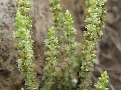 Соцветие представляет собой колосовидный тирс с сидячими или почти сидячими цветками. Цветонос значительно короче листьев и имеет листовидные прицветники. Чашечка состоит из лопастей продолговато-эллиптической формы, длиной 3,5-4,5 мм, острых, иногда втянутых в концевой волосок. Лопасти мясистые, зеленые, с краевыми ресничками[3].