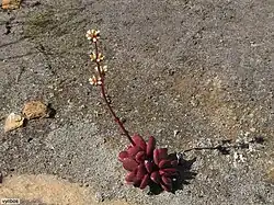 Растения многолетние, обычно с несколькими прикорневыми розетками, редко сильно разветвленные, с мясистыми или слегка деревянистыми ветвями и старыми, не опадающими листьями. Листья, от обратноланцетных до обратнояйцевидных или эллиптических, размером 20-40(-60) х 5-13 мм, могут быть от тупых до округлых, сверху плоскими или слегка выпуклыми, снизу очень выпуклыми, на земле загнутыми и более или менее плоскими. Они обычно окрашены в пурпурно-красные, редко в желтовато-зеленые или зеленые оттенки. Листья могут быть голыми, редко с короткими волосками и/или краевыми ресничками[2].