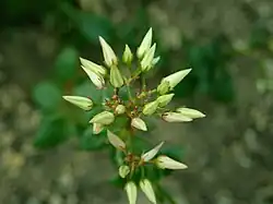 Соцветие представляет собой тирс с округлой или плоской вершиной, на котором цветы раскинуты примерно под прямым углом друг к другу. Чашечка состоит из линейно-треугольных лепестков длиной 1-3 мм, острых, голых, мясистых, зелёных. Венчик звездчатый, у основания едва сросшийся, белый или кремовый, иногда с красным оттенком. Тычинки с пыльниками от белого до розового цвета[5].