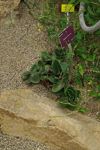 Многолетнее[4] суккулентное растение высотой от 20 до 35 см[1], которое может быть как полегающим, так и прямостоячим. Корневая система мочковатая. Побеги имеют диаметр 5–10 мм. Листья широкоэллиптической формы, тёмно-зеленые, сидячие, размером 4–6,5 x 2,5–4 см, с темно-пурпурной нижней поверхностью. Края листьев цельные или почти зубчатые, слегка закрученные, с острым или заостренным кончиком[5].