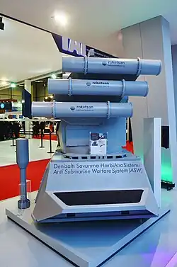 Противолодочное вооружение представлено 196-мм шестиствольными реактивными установками Roketsan турецкого производства[3].